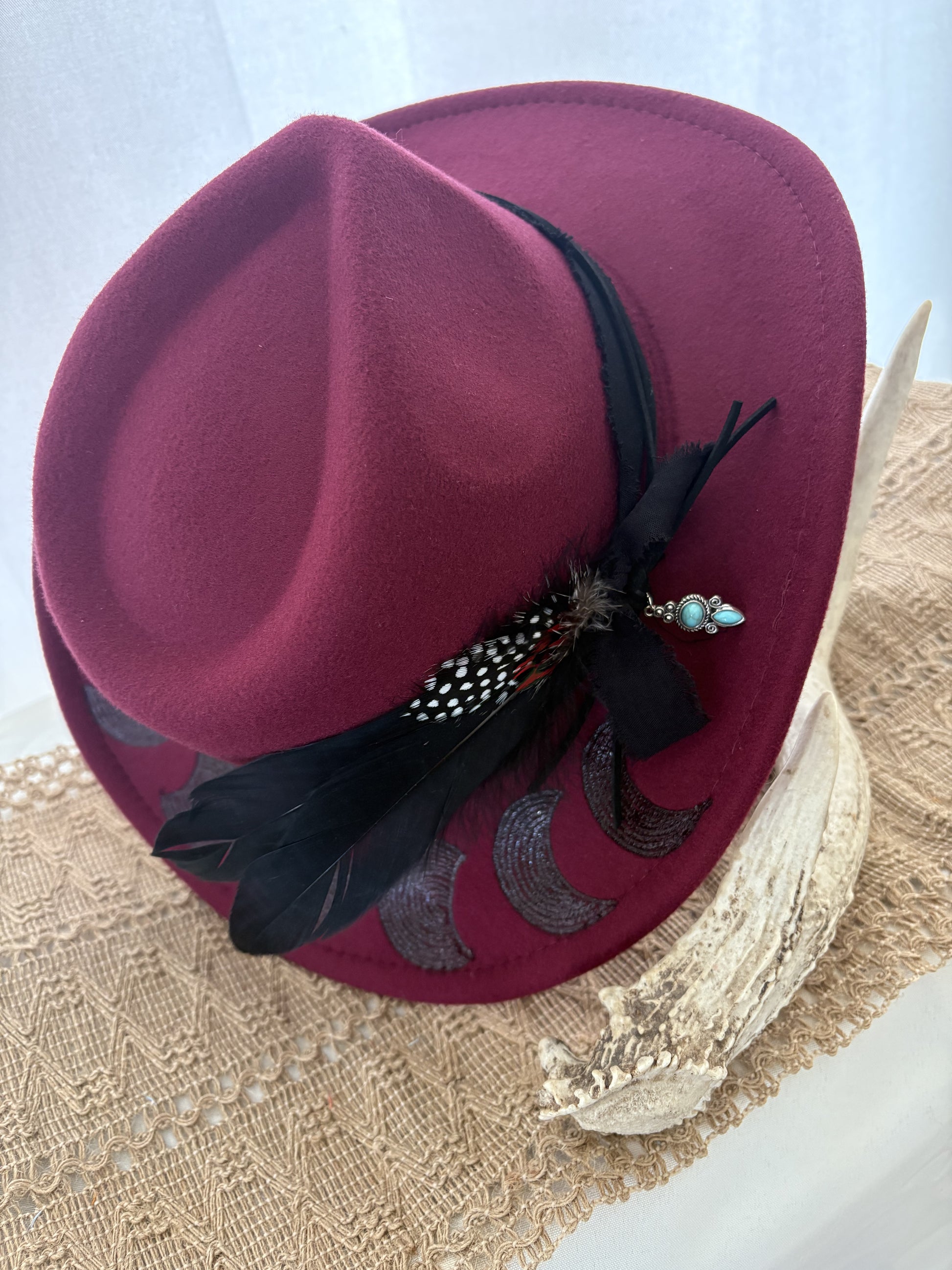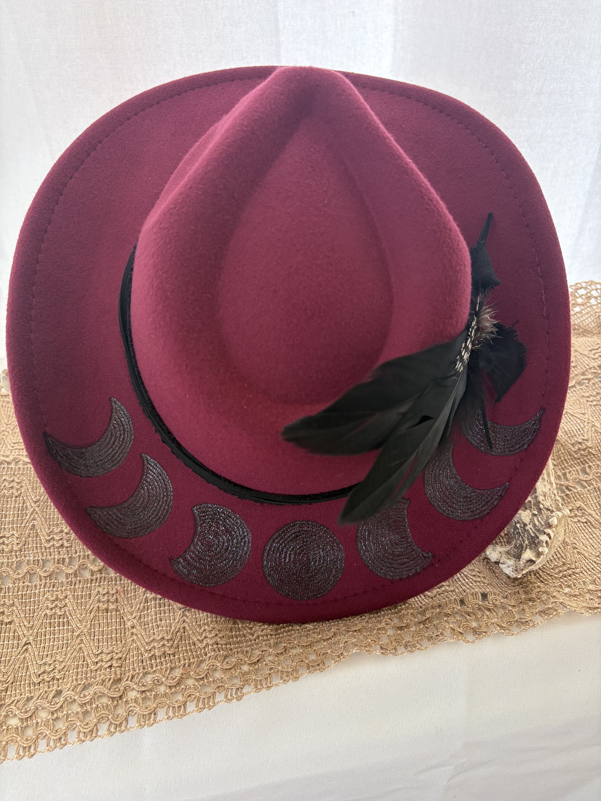 Channel your inner moon goddess with our Moon Deity wine coloured cowboy hat . Featuring moon phases , this hat is perfect for adding a touch of divine feminine to any outfit. The eccentric design is sure to make a statement wherever you go. (Celestial style without the celestial price!)