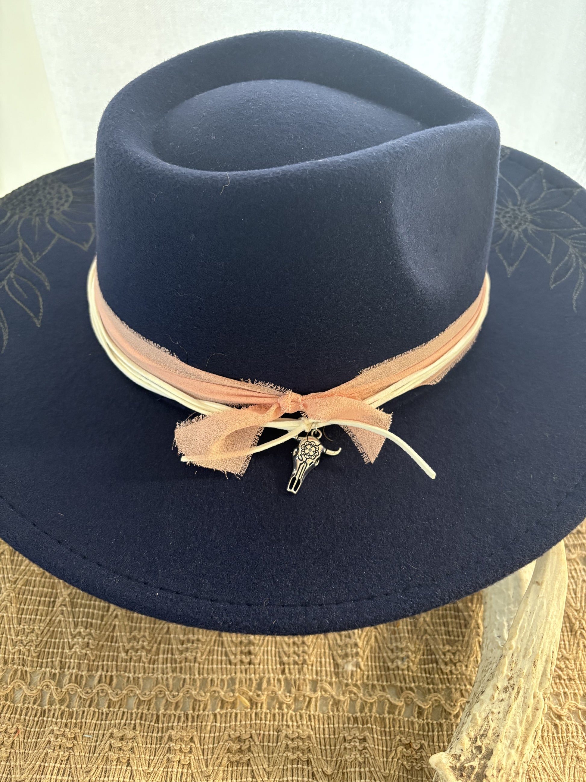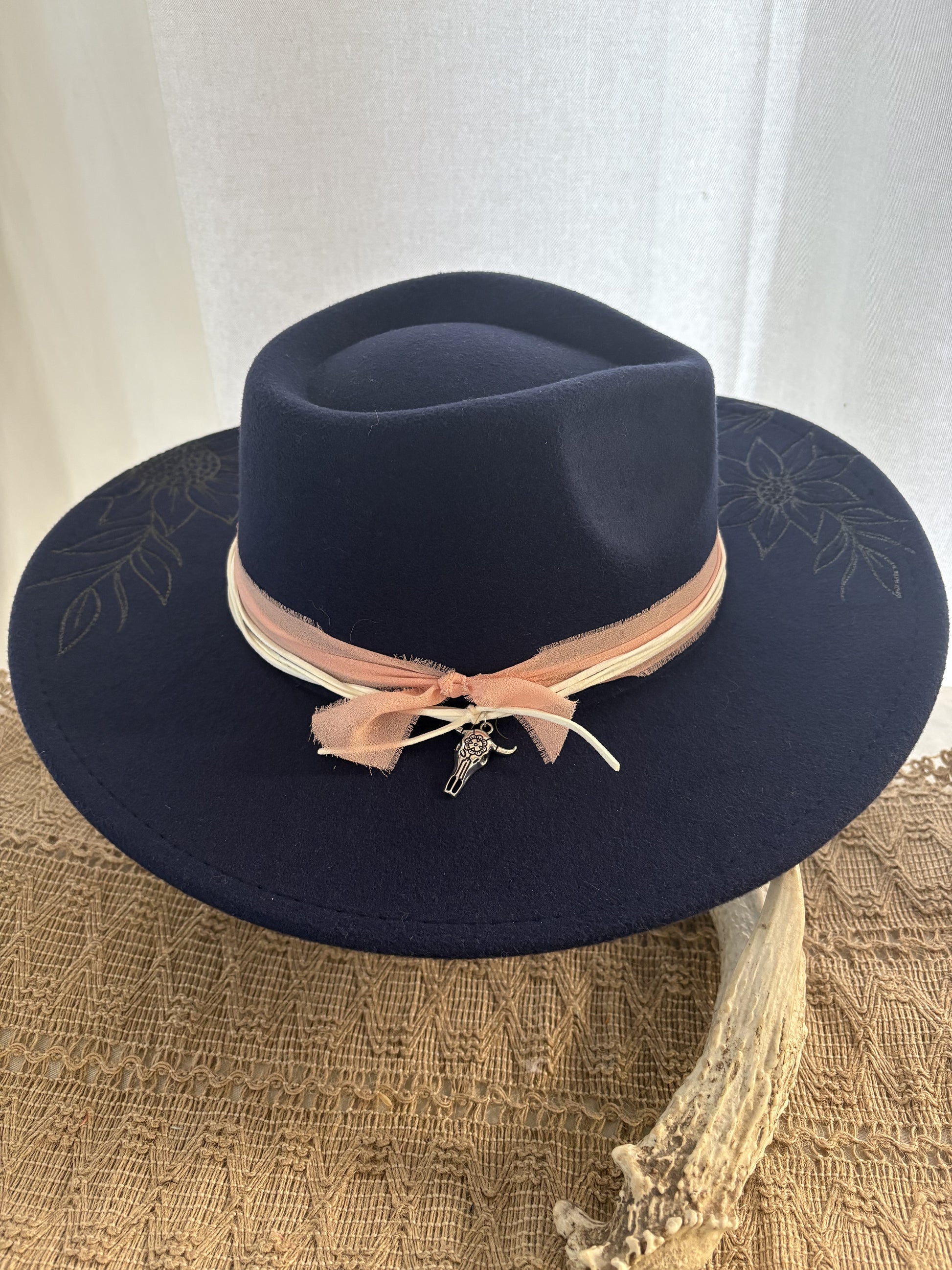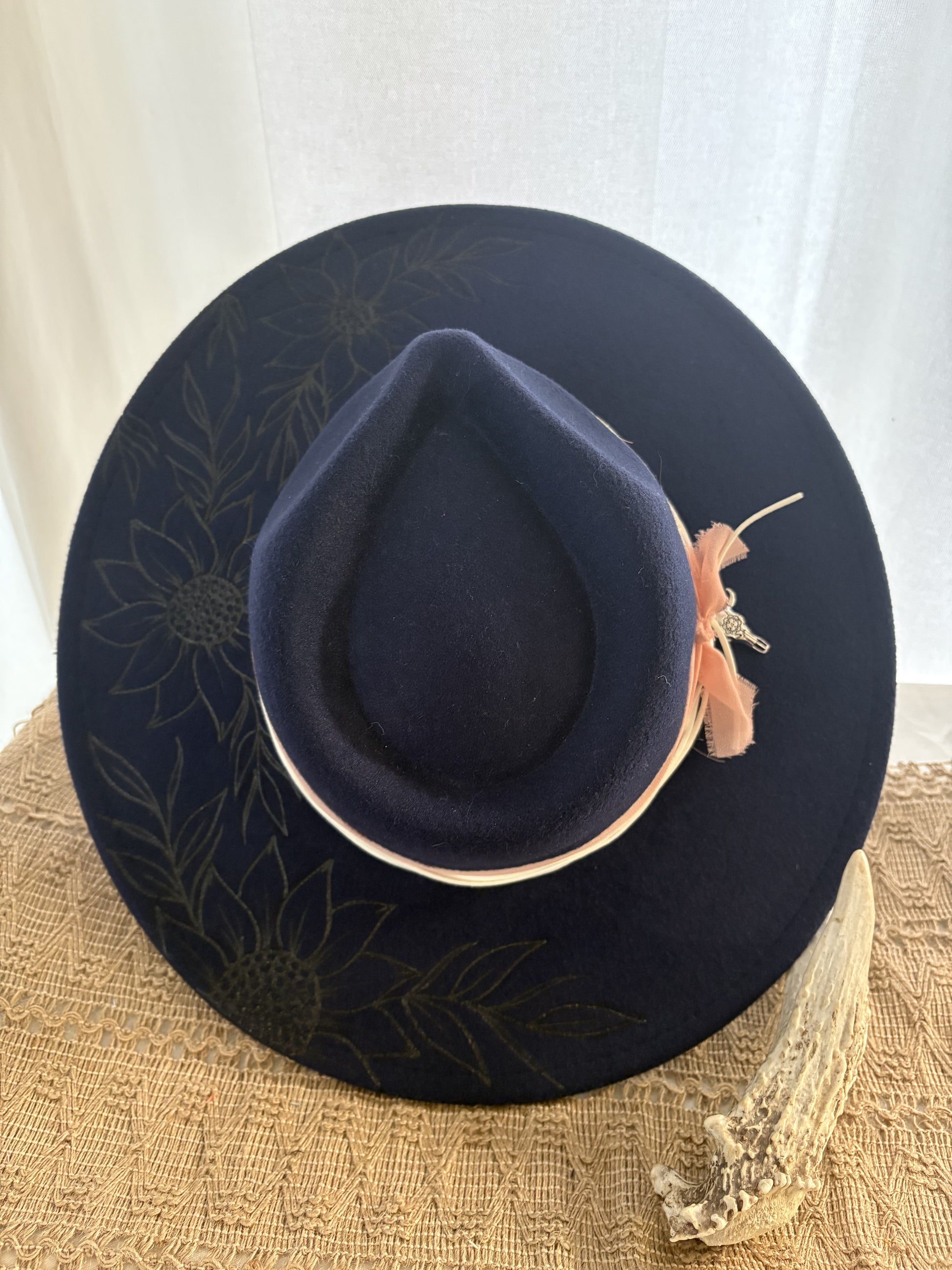 Turn heads in this whimsical Sweet Sunflower 🌻 navy coloured wide brim Fedora . This timeless design will have you tipping your brim in style and whimsy.